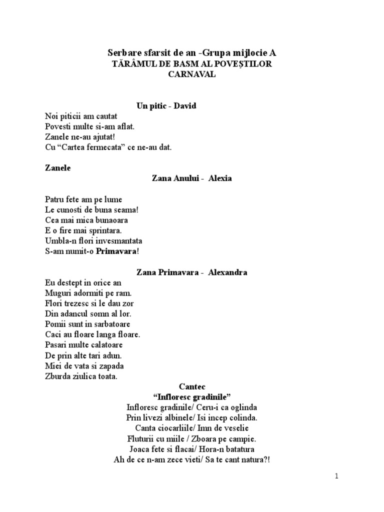 Dobrotam pentru noi cei mici si mari toti cei adunati aici astazi este sarbatoare noi copiii dam serbare vom fi flori in gradinita vom fi maci si garofite.